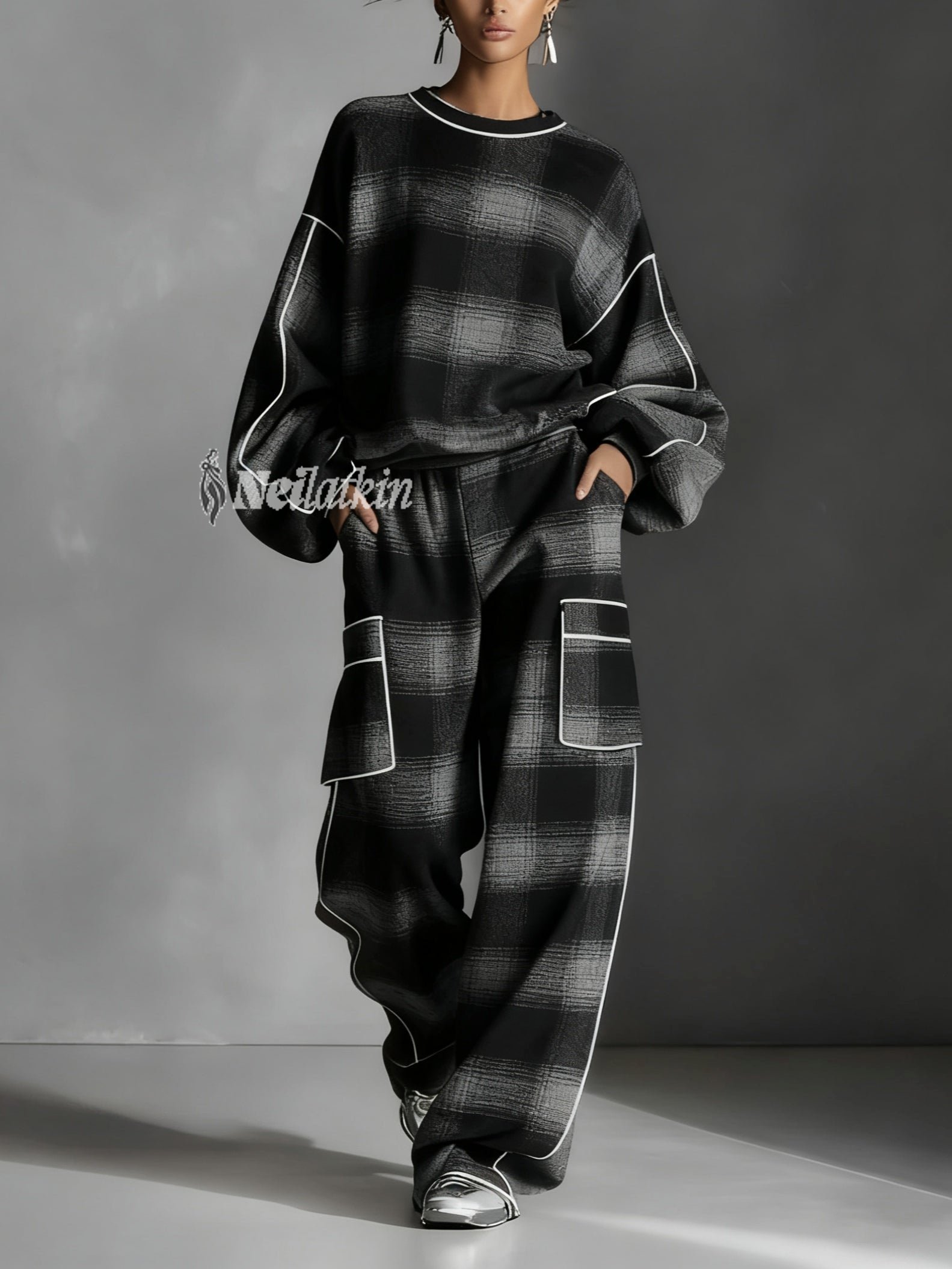 Product Description These black and grey plaid casual trousers, adorned with distressed details and contrasting piping, create a bold street style, suitable for casual occasions or trendy everyday wear.