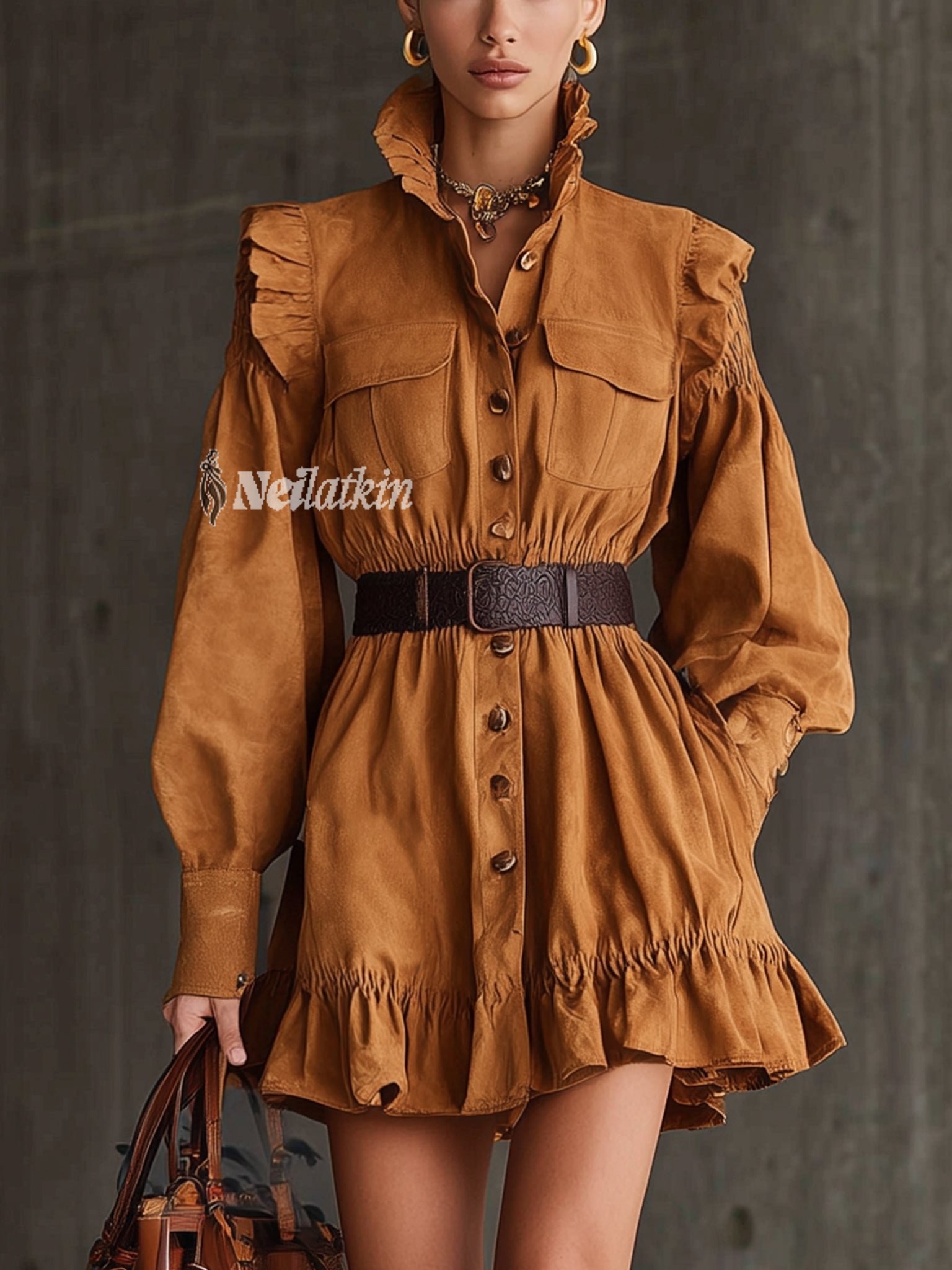 Belted Waist: The detachable wide waist belt in textured dark leather cinches the waist elegantly, enhancing curves and adding contrast to the soft suede fabric.