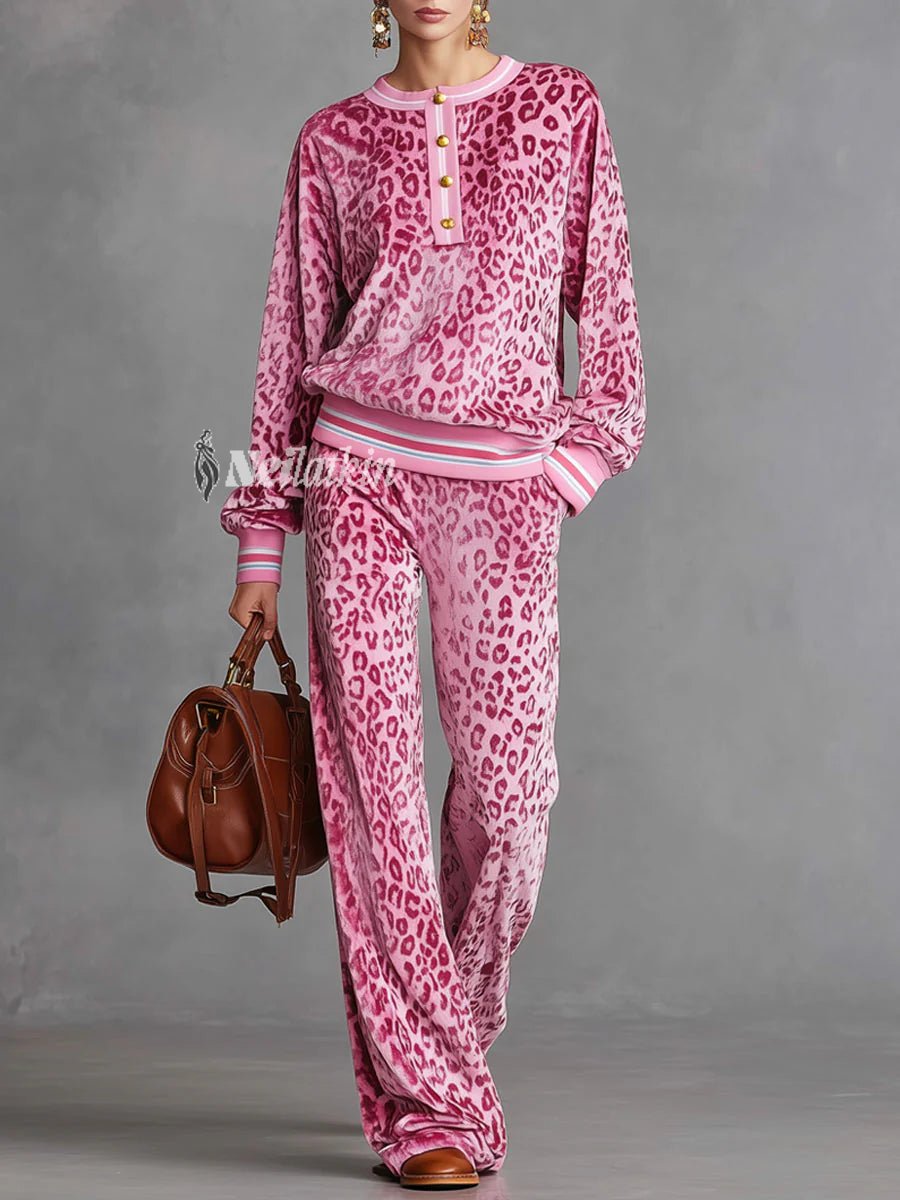 Casual pink velvet leopard print sweatshirt and wide-leg pants set