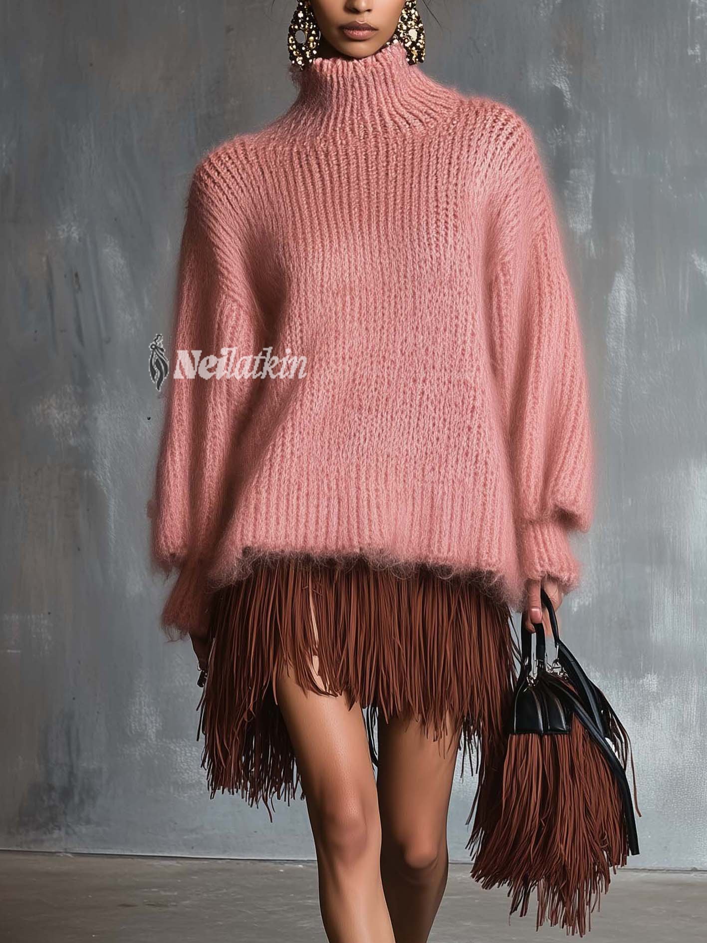 This piece merges cozy knitwear with playful fringe elements, striking a balance between comfort and bold style. The oversized pink sweater adds softness and warmth, while the brown tassel mini skirt injects movement and edge, making the design both chic and fun. The combination of textures—soft knit and structured fringe—creates visual depth and a runway-inspired aesthetic.