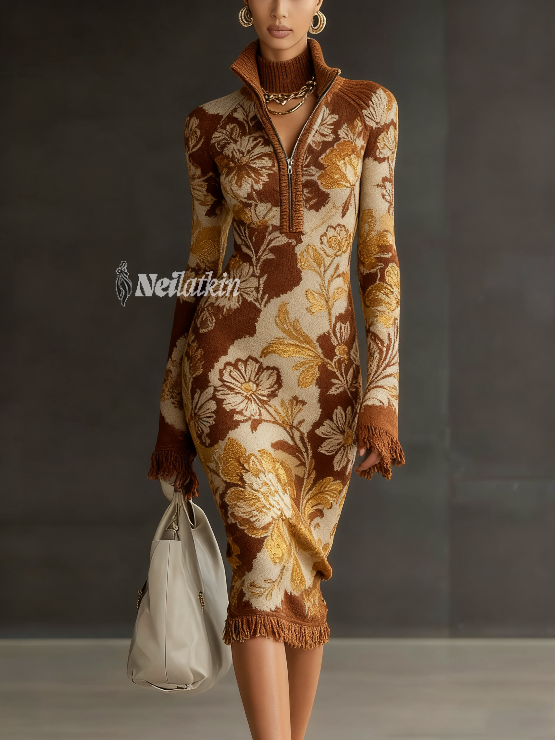 Design: This midi-length knit dress features a striking abstract color-blocking design in rich teal and cream tones. A versatile half-zip front adds a sporty-chic touch, while the stand collar elevates the neckline. The standout detail is the raw-edge fringe trim at the hem and cuffs, adding a touch of modern texture and playful movement.