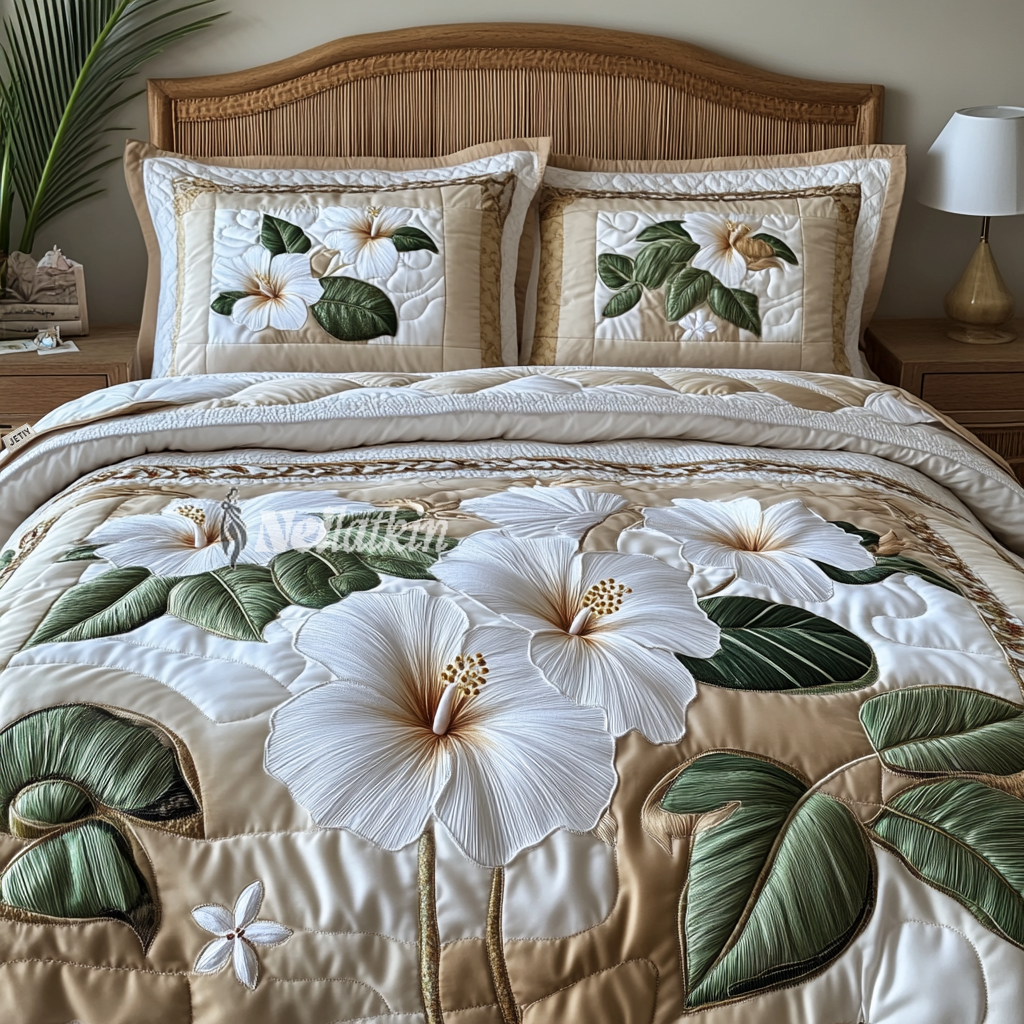 White Hibiscus 3-Piece Quilted Bedding Set NCU0DV4452