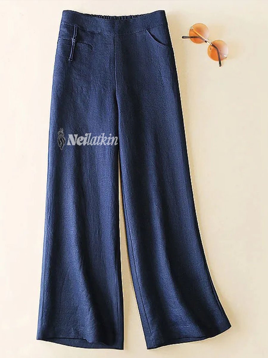Women's Solid Color Button Half Elastic High Waist Casual Cotton and Linen Wide Leg Pants
